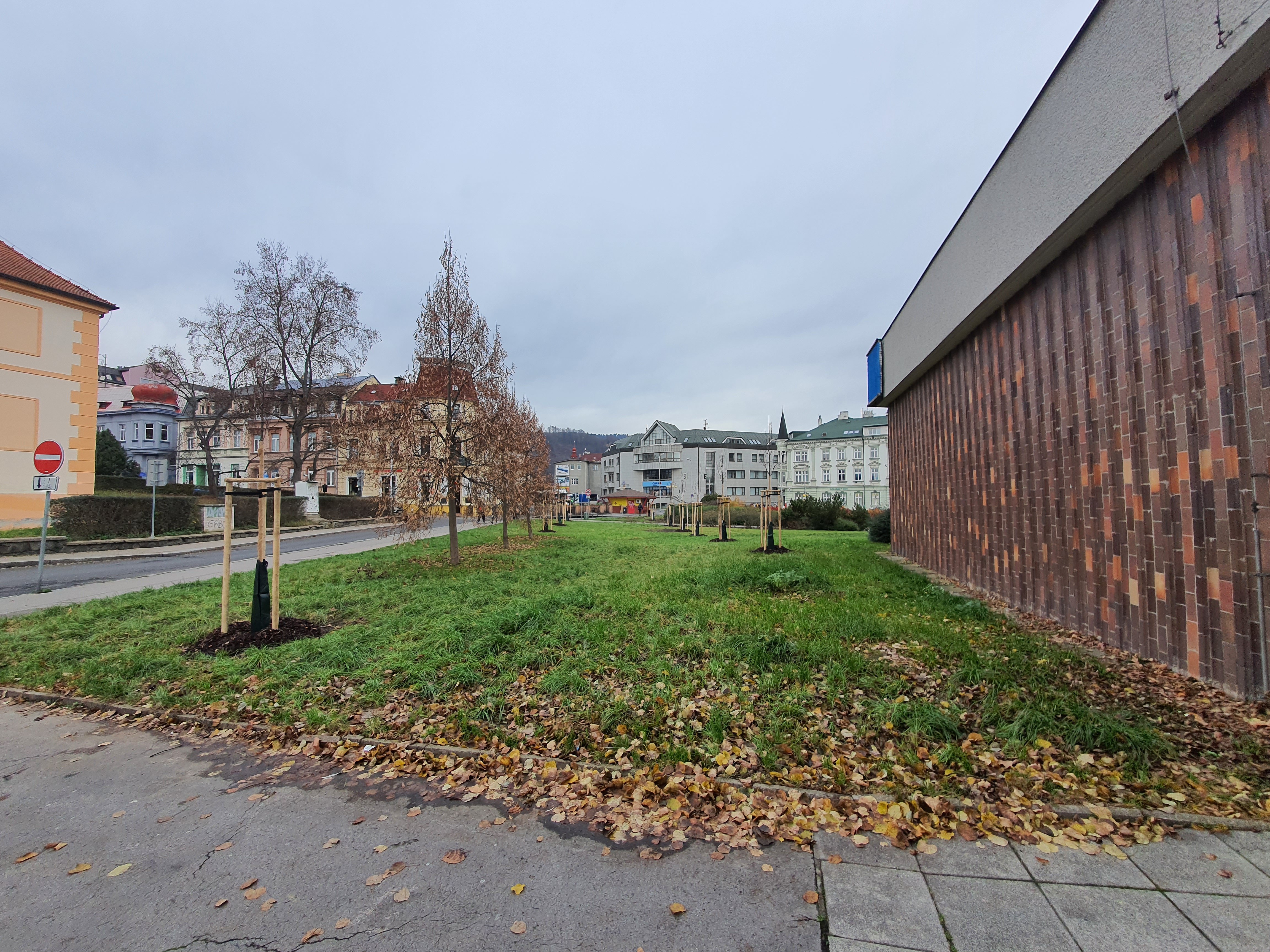 První etapa, zahájená v říjnu 2024, řeší chodníky před hlavním vstupem budovy, směrem k ulici Pohraniční a zastávce MHD Myslbekova. Při její realizaci dojde nejen k výměně povrchu, ale i k mírné modifikaci průběhu chodníku, jak je vidět z přiloženého nákresu situace. Důvodem pro tuto změnu byla jednak potřeba oddělit chodník od přímo navazující Lázeňské ulice, kdy řidiči občas řešili potřebu parkování vjezdem na tento chodník. Druhým důvodem byl artefakt Tabula Rasa, pospaný v přechozím odstavci, který se touto změnou ocitne ve středu zpevněné plochy. Díky spolupráci s vedením města, kterou opět zastřešuje arch. Ondřej Beneš, plánuje město navázat na tuto akci a zrekonstruovat ve stejném duchu ulici Pohraniční a Zámecké náměstí. Celá oblast by se tak měla esteticky pozvednout a vytvořit důstojné prostředí pro okolí vysoké školy, odpovídající své poloze s přímou návazností na historický střed města. Dojde také k další výsadbě stromů, které doplní v předchozích letech založenou lipovou alej. Pro přímo navazující zelené plochy kolem chodníků máme dále připravený plán na výsadbu okrasné zeleně. Pro tu bude ovšem nejdříve potřeba zajistit financování.