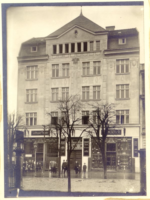 Detail budovy divadla z předchozích snímků, o mnoho let dříve. Na pozdějších snímcích už chybí stromy před budovou a fasáda je ve špatném stavu. Na tomto místě je dnešní hlavní vchod do budovy.