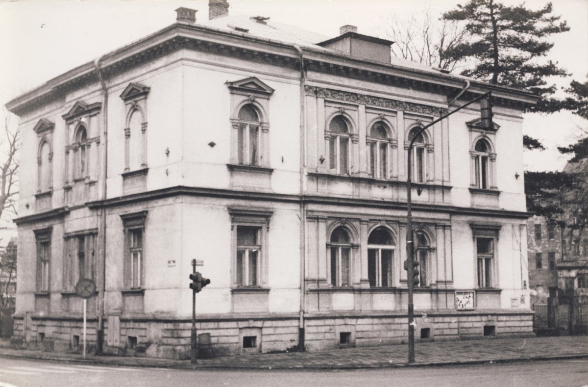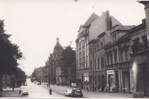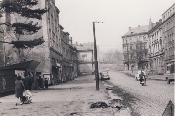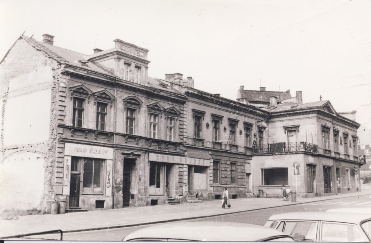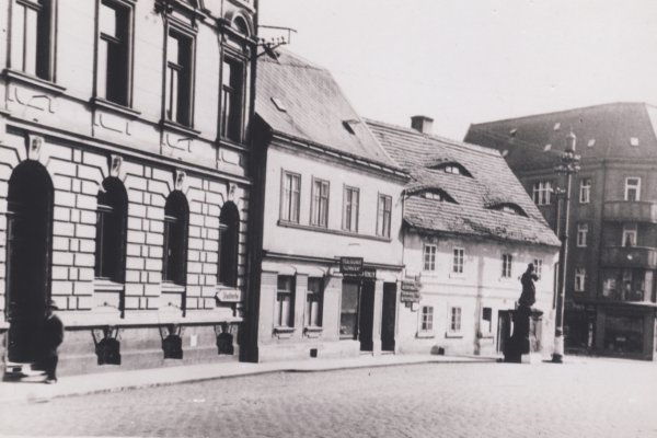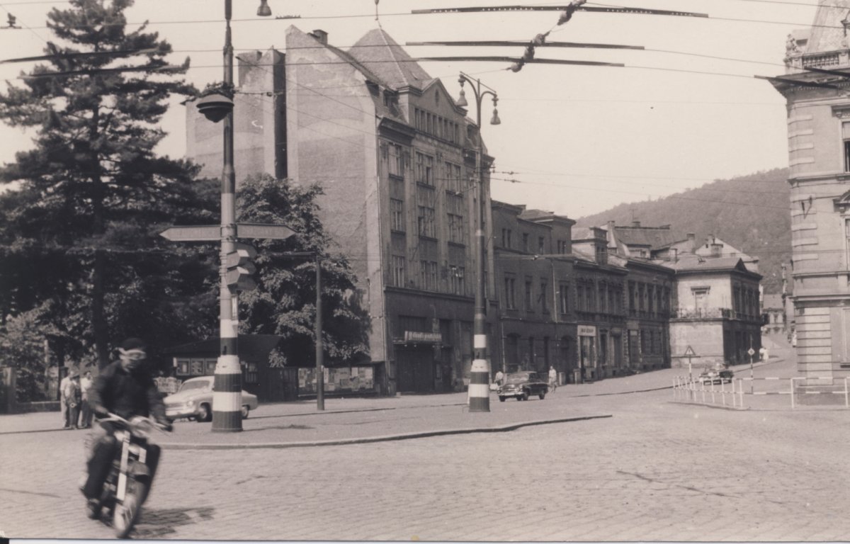 Pohled z křižovatky ulic Myslbekova a Pohraniční směrem ke kostelu sv. Václava a sv. Blažeje (zády k naší budově). Ze stejného místa dnes kostel neuvidíte, v cestě Vám budou stát panelové domy, které brutálně poznamenaly centrum města. Místní jistě poznají budovu úplně vpravo, stojí dodnes na svém místě. V jejím přízemí a suterénu je restaurace Ve Dvoře.