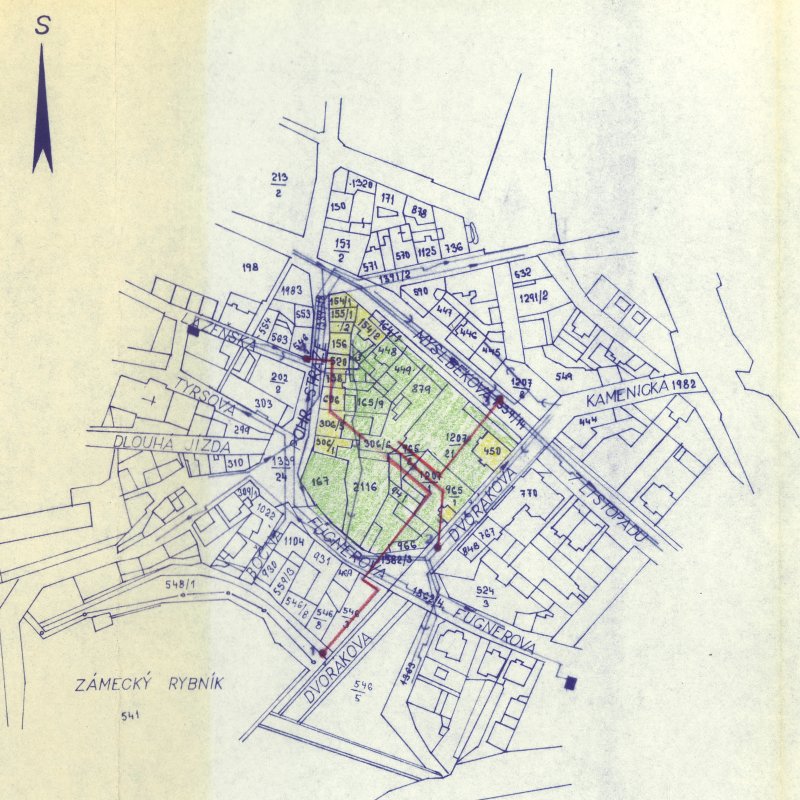 Fotografie ze Zámeckého náměstí, od Dlouhé jízdy směrem k Zámeckému rybníku. Oba domy v ulici Fügnerova stojí dodnes.
