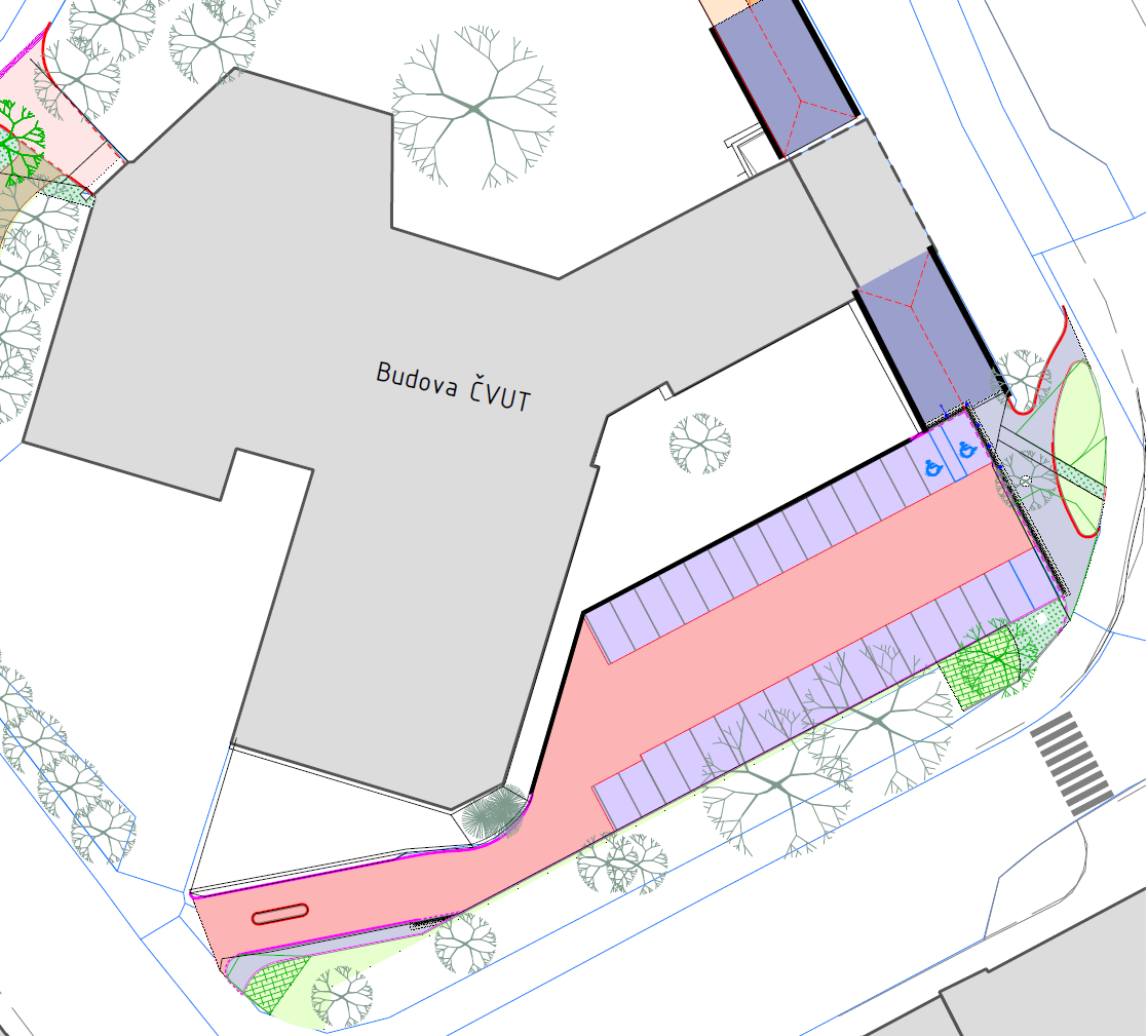 V říjnu 2024 bude zahájena 1. etapa revitalizace zpevněných ploch kolem budovy ČVUT. Tato etapa zahrnuje chodníky před hlavním vstupem budovy, směrem k ulici Pohraniční a zastávce MHD Myslbekova. Při její realizaci dojde nejen k výměně asfaltového povrchu za kamennou dlažbu, ale i k mírné modifikaci průběhu chodníku, jak je vidět z přiloženého nákresu situace. Přístup hlavním vchodem do budovy bude po dobu stavby i nadále možný, ovšem pouze směrem z parkoviště. Chodci budou samozřejmě také moct využít zadní vchod ze Zámeckého náměstí. Tato etapa by měla být dokončena na jaře 2025, dle klimatických podmínek. Za snížený komfort během stavby se omlouváme, ale věříme, že výsledek bude stát za to.